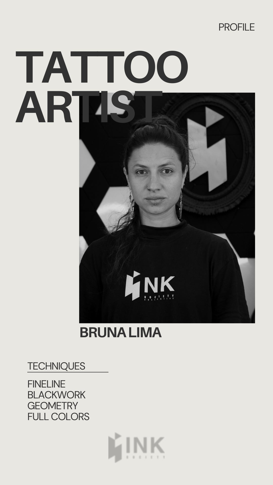 With over 13 years of experience, Bruna Lima is a tattoo artist specialized in fine line, blackwork, and colourful tattoos. Her work stands out for its precision, balanced composition, and unique artistic style that blends technique with refined aesthetics.
